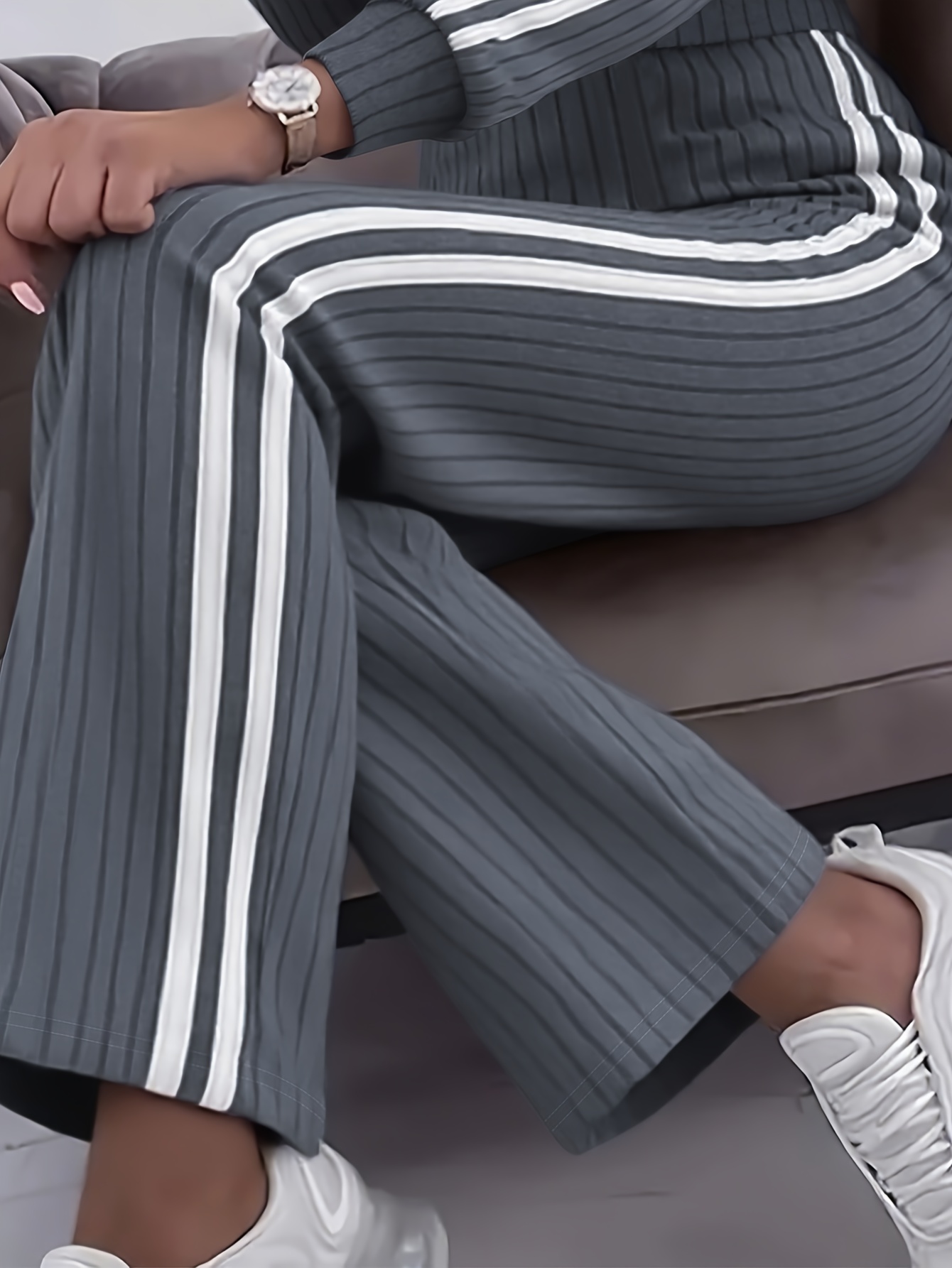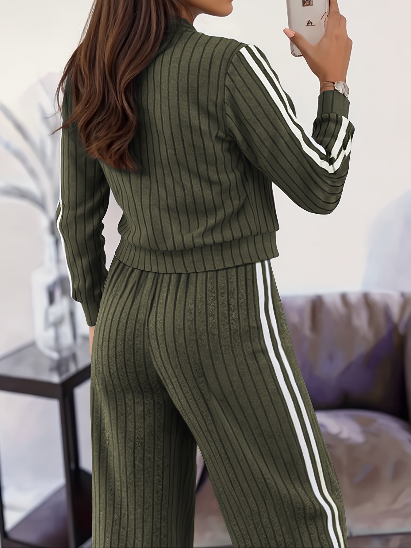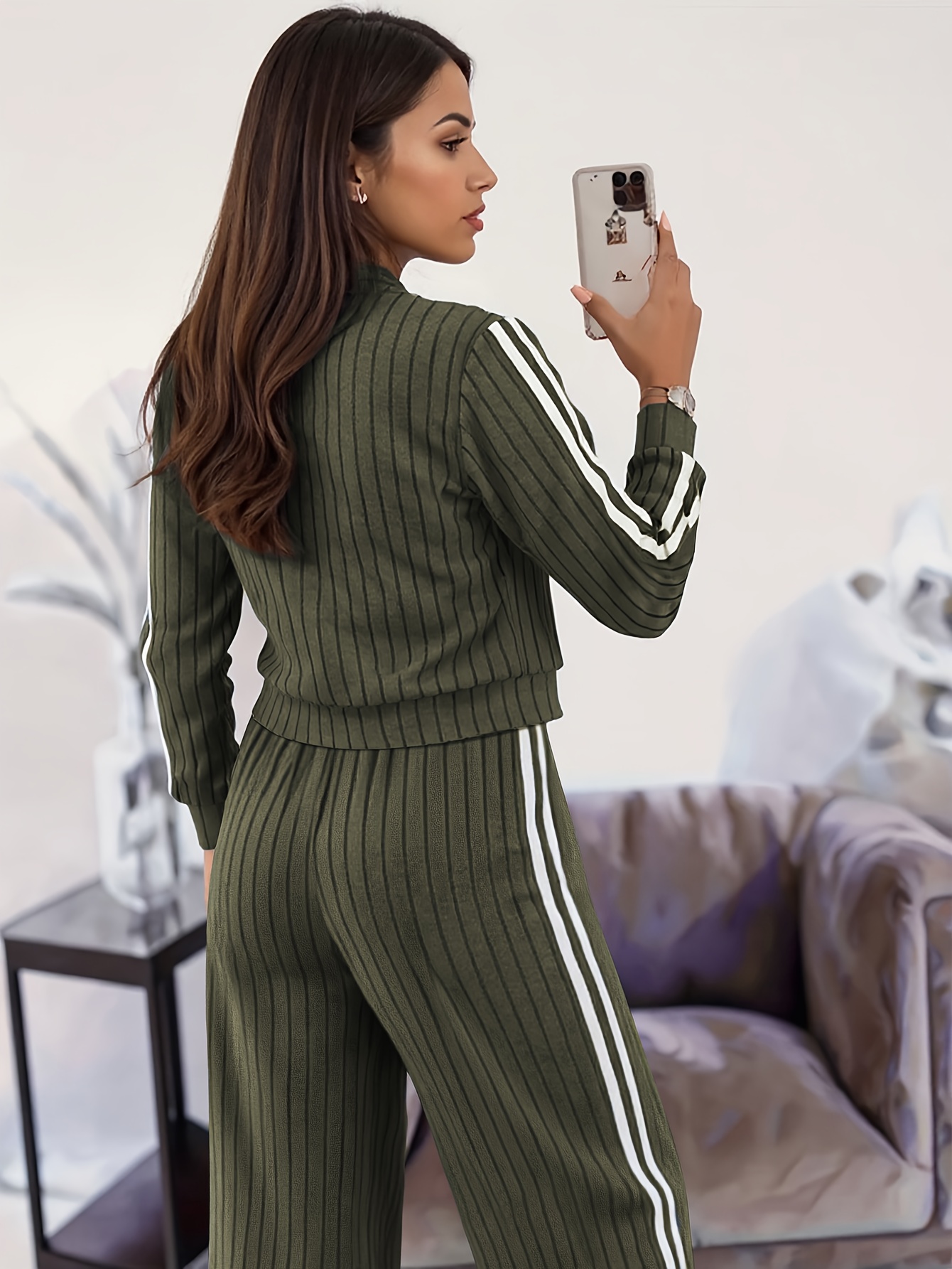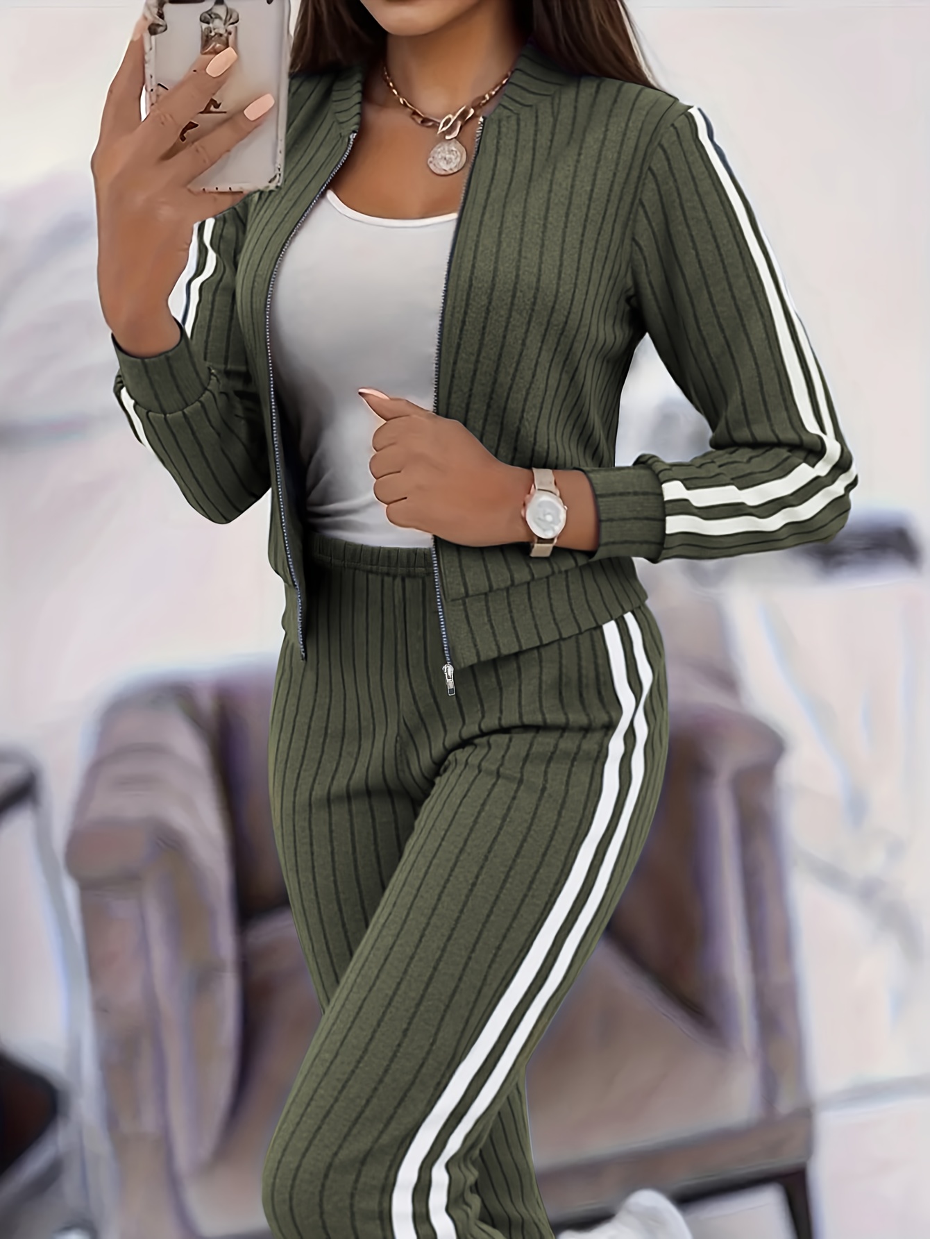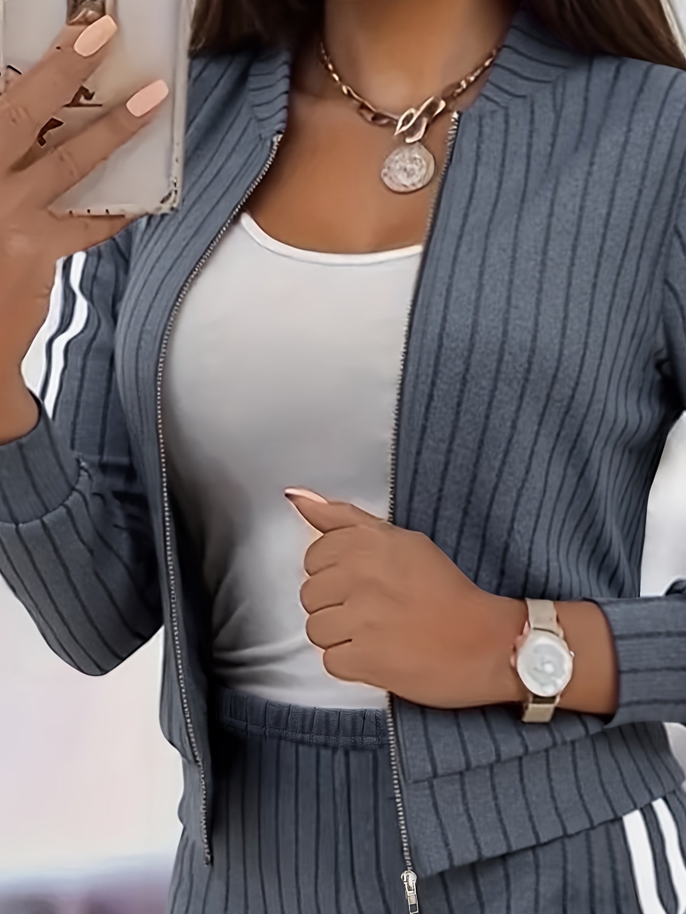 • Two-piece set: zip-up cardigan + straight-leg pants